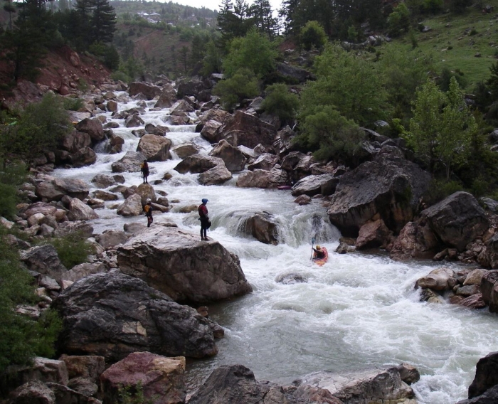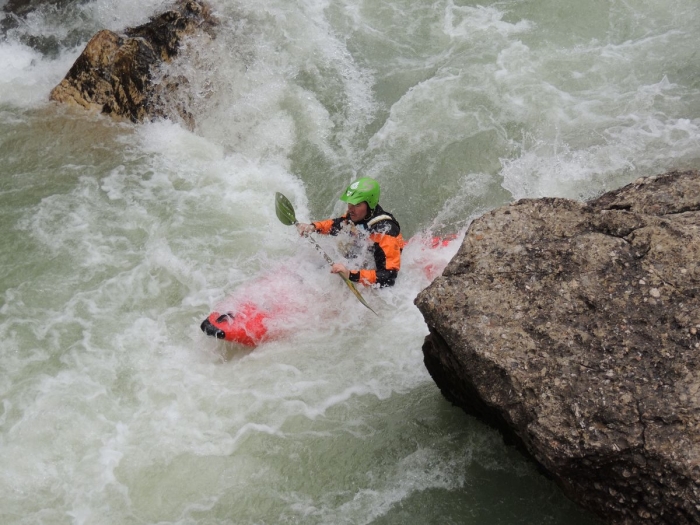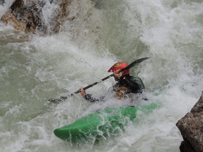 Iets over het midden komen we aan een zwaar verblokte passage, met groot verval. Er wordt veel gewikt en gewogen. Uiteindelijk draagt de helft van de groep het hele stuk om. De anderen varen alleen het laatste stuk van de blokkendoos. Het blijkt nog een mooi stukje te zijn met een leuke drop in het midden.