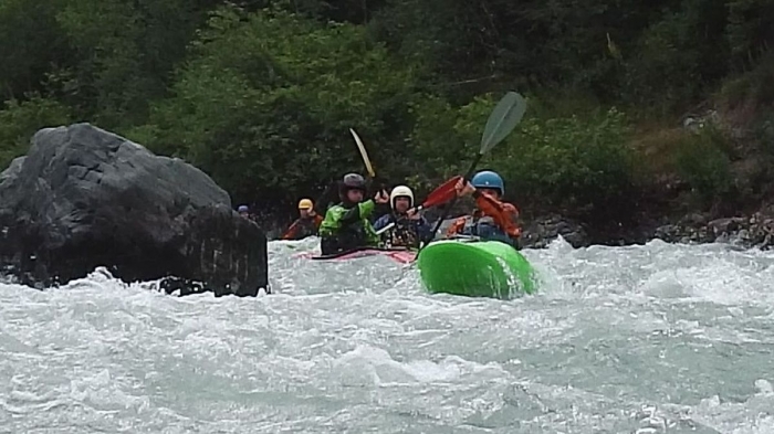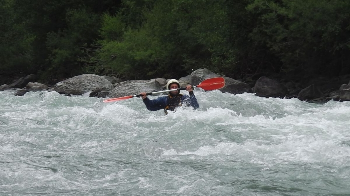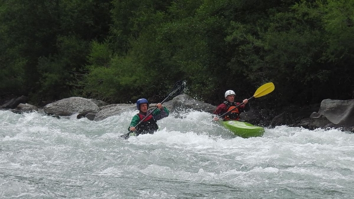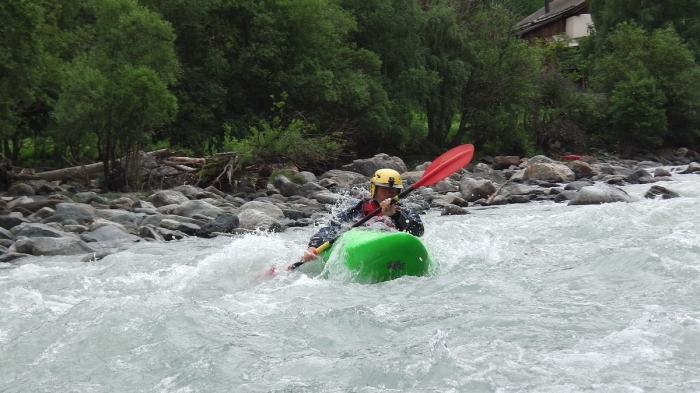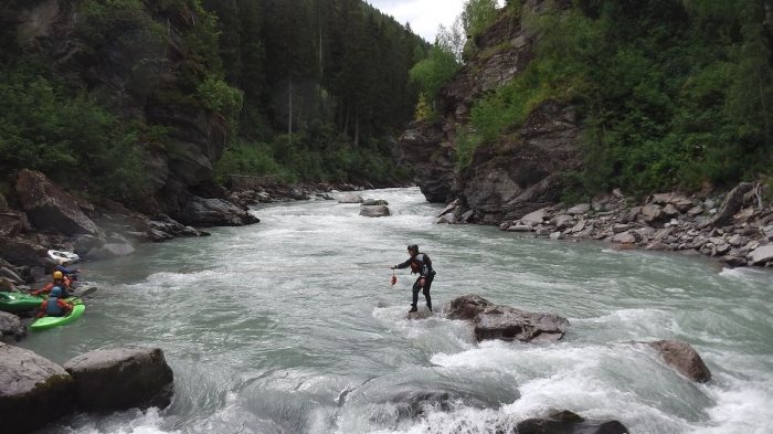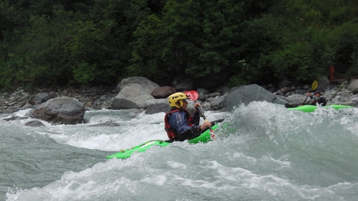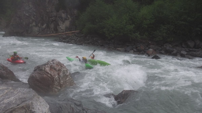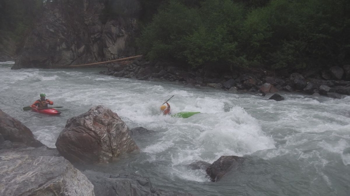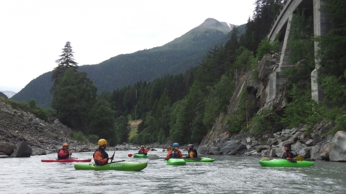 Na een lang nachtje gietende regen van België naar Oostenrijk, komen we toe aan de camping van Prutz waar Nirjhara haar tenten heeft opgeslagen. Nirjhara is die leuke bende kajakkende gekken die dit jaar hun zomerkamp hebben in Prutz en waar ik enkele dagen mee mag varen op uitnodiging van Jan VanRoy. Het contrast van hun campement met mijn normale minimalistisch kamperen kan moeilijk groter zijn:. campers, karavans, kooktenten, gigantische gasvuren, tafels en stoelen en een waar kookteam. Na het ontbijt vertrekken we richting Zwitserland om daar een stuk te kajakken dat geschikt zou zijn voor beginners zoals Nand en mezelf. Onderweg gaat het over keerwaters, molens, waserrettes, gaten en putten, Pirhana, Fluids, Rockers,... en andere vreemde wezens. Benieuwd wat wild water gaat zeggen.