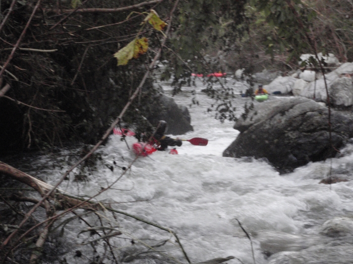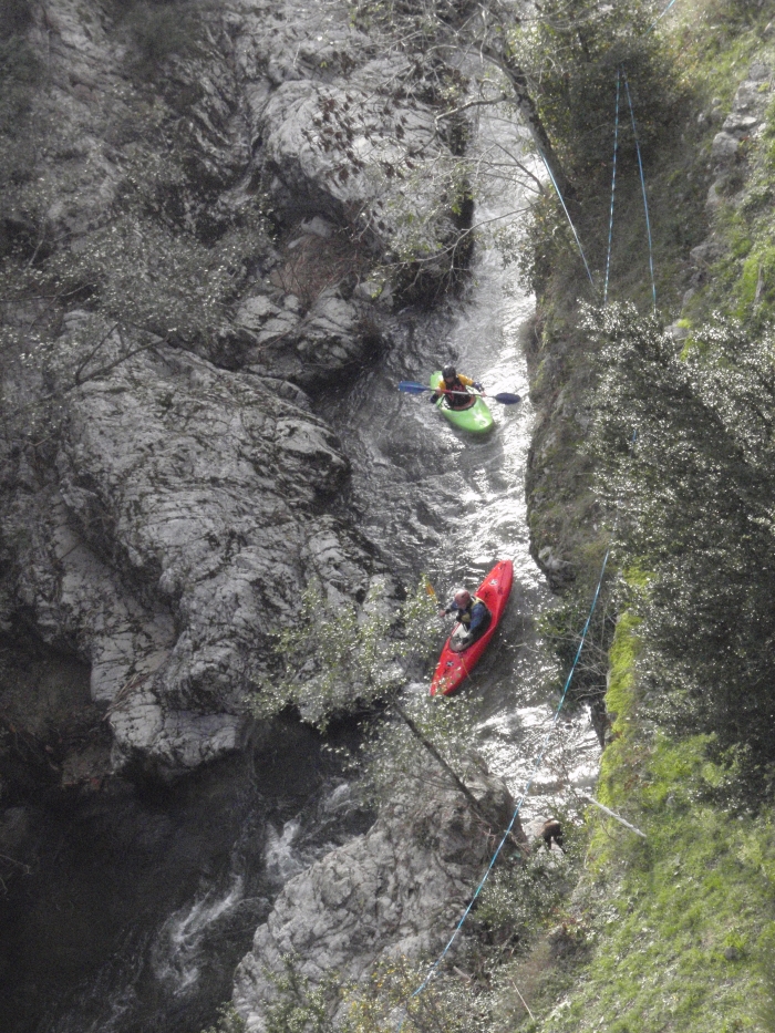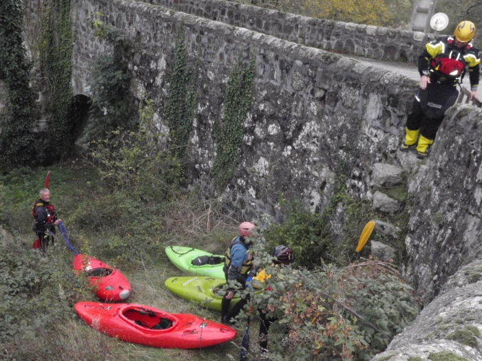 De Auzène kan integraal gevaren worden, dus we stappen in waar we gisteren gestopt zijn. Als uitgelaten schoolkinderen kleden we ons snel om. Menno heeft ook al zijn neopreen half aan, tot hij zich ineens bedenkt. Neuh, toch niet varen. Even verwacht hij hetzelfde besef bij de anderen, maar nee hoor, even later klauteren 4 kayakkers al lachend naar beneden.