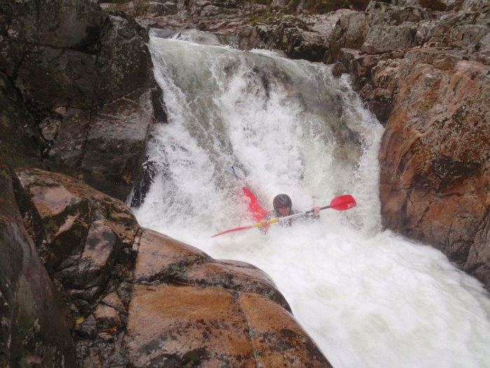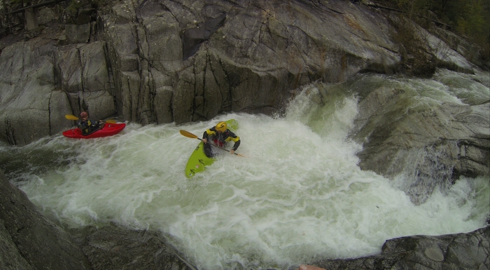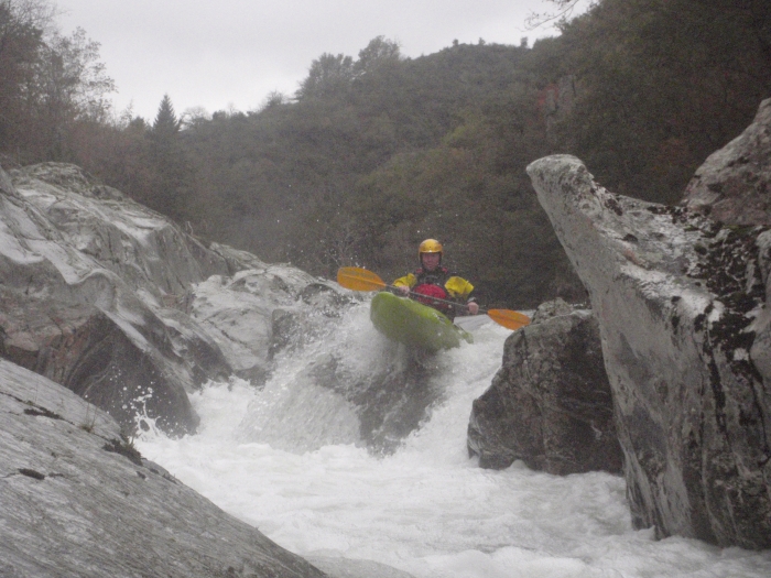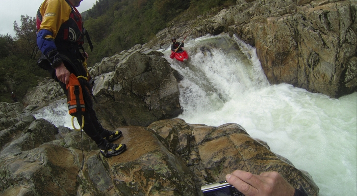 Halverwege haalt een grote groep Franse kajakkers ons in. Ze kennen de rivier en hebben er duidelijk veel lol in (al zien we in de korte tijd dat we samen varen een 3 tal zwemmekes). Een paar van hen zijn echt wel fanatiek: gisteren deden ze de rivier 2 maal en tijdens het omkleden aan de uitstap zien we 3 van hen de laatste zware passage opnieuw enchaineren.