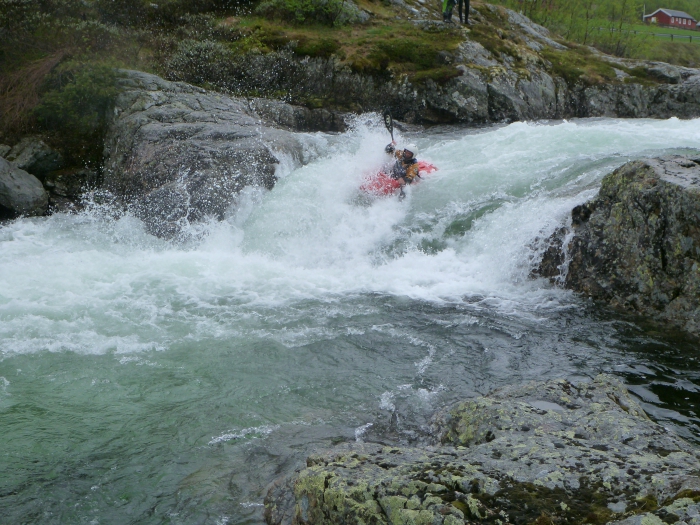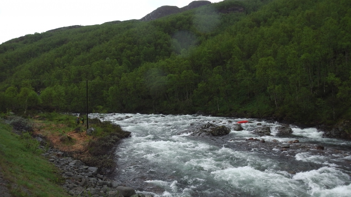 Ik denk dat we kunnen stellen dat dit een zeer efficiente manier is om het fysieke niveau van wildwater kajak serieus op te krikken. Voorstel is wel om het gebruik van droogpakken te verbieden om alles nog wat harder en minder sissy te maken. Na 1km zat iedereen zo op zijn tandvlees dat we maar op de klassieke routine van varen en omdragen zijn overgestapt.