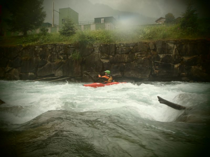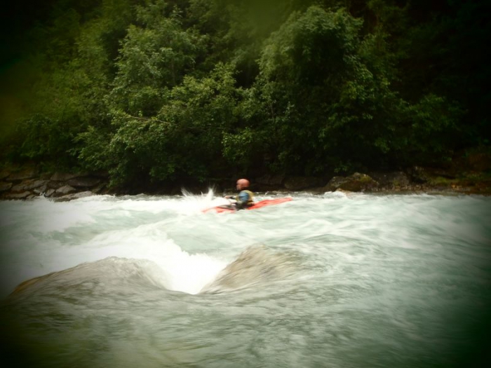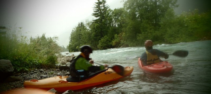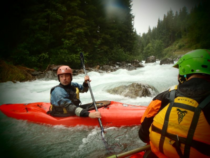 Nadat Birdy, Voenkel en 't Rekkerken de bovenloop van de Defereggenbach (aka Schwarzach) hebben bedwongen waar ik ruimhartig de rol van shuttlebunny op mij heb genomen volgt een korte rit naar de instap van het standaard traject. Inmiddels is het weer omgeslagen van af een toe een druppel naar gestage regen met af en toe een klap onweer en na kort overleg wordt het "platte stuk" van het traject afgeknipt en varen we niet helemaal naar Zotten maar slechts tot net voorbij Bruggen. De peilschaal staat op 85cm wat overeenkomt met middenwater.