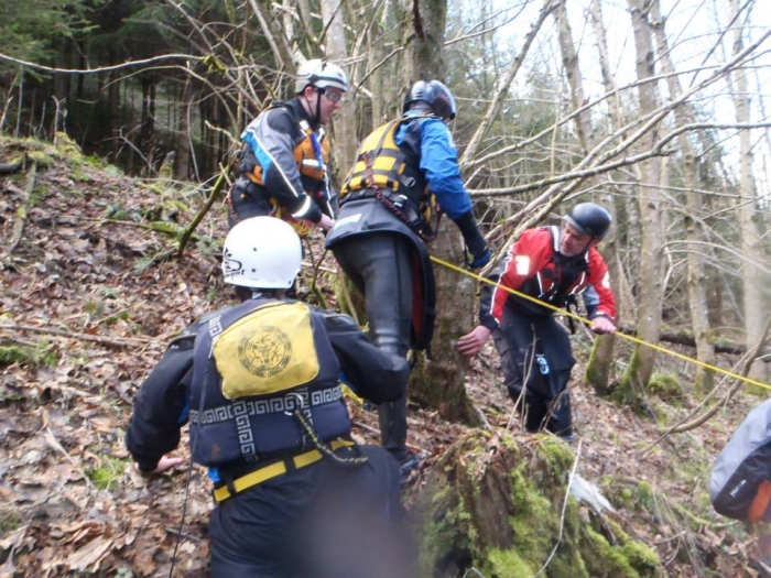 Op dan naar het bergen van materiaal. Bootjes en peddels aan de kant krijgen met behulp van de cowtail. Met de duckies ging dit vlotjes, met een ondergelopen hardshell toch al minder simpel.