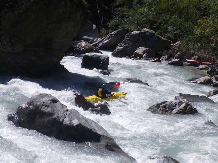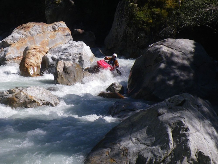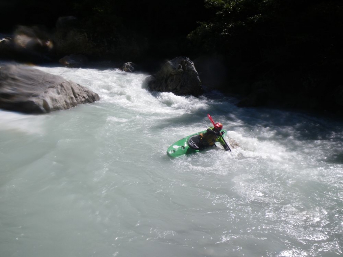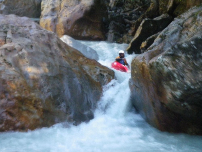 Helaas ik kom niet tot stilstand maar mij top glijd naar boven op de rots schuif links nagenoeg verticaal in het volgende verval af en ik maak een mooie backloop.
