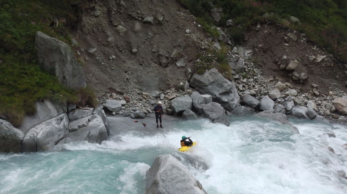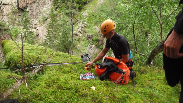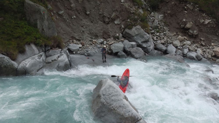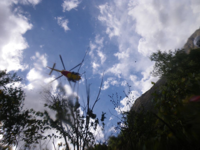 Nadat ik duidelijk gemaakt heb dat er helemaal geen noodgeval is blaast de helikopter de aftocht. Omdat mijn boot nu, door de schuld van de helikopter, de grote (onbevaarbare) kloof ingeduikeld is, willen die mannen van de bergreddingsdienst mij wel mee helpen zoeken. Als snel blijkt dat hij een 50 m verder gekneld zit. De toegang kan echter enkel via de bovenzijde van de kloof.