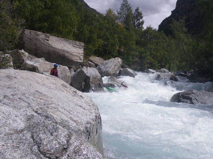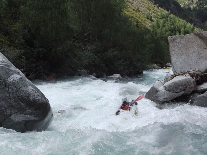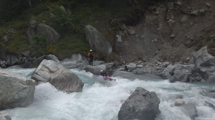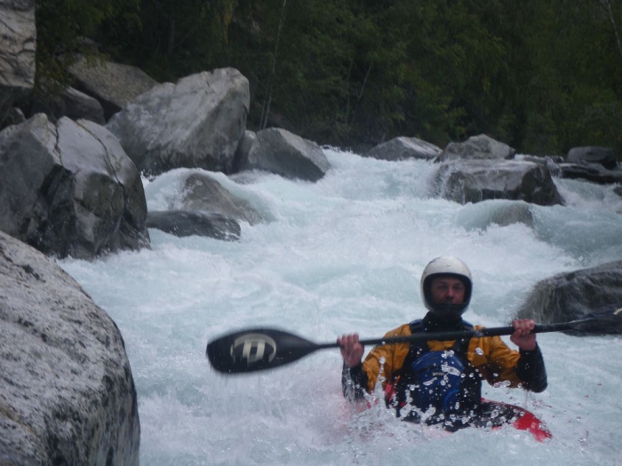 Hoewel het bij mij allemaal vrij vlot loopt en goed in mijn boot zit wordt ik op gegeven ogenblik tegen een onschuldige overhangende rots geduwd. Ik kan niet vermijden dat ik omgeduwd wordt en probeer meteen te rollen. Bij de eerst poging kan ik niet in de goede positie komen omdat ik mijn hoofd tegen de grond voel beuken. Bij de tweede poging zit mijn peddel klem achter een rots. Bij de derde poging weet ik niet meer waarom het niet lukte, het enige dat ik wel weet ik dat ik (misschien toch iets te snel) uit mijn boot ben gekomen. Ik kan nog net mijn peddel vast grabbelen maar ik zie een stevige passage naderen en besluit mijn boot maar niet achterna te zwemmen en de oever op te zoeken. Mijn vaarmakkers doen enige pogingen om mijn boot te pakken te krijgen maar de passages die komen laten niet toe om zonder grondige inspectie mijn boot achterna te varen. Ik zie mijn boot dus met lede ogen de rivier afstuiken.